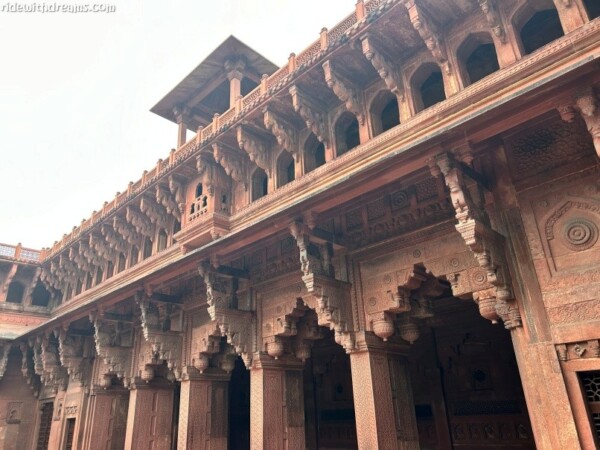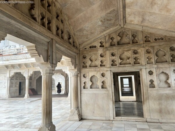 Arriving at Agra Fort early in the morning, we found the complex peaceful and serene, with beautifully maintained gardens bathed in soft light. I was especially drawn to the intricate white marble walls, inlaid with colorful gemstones forming delicate floral patterns.